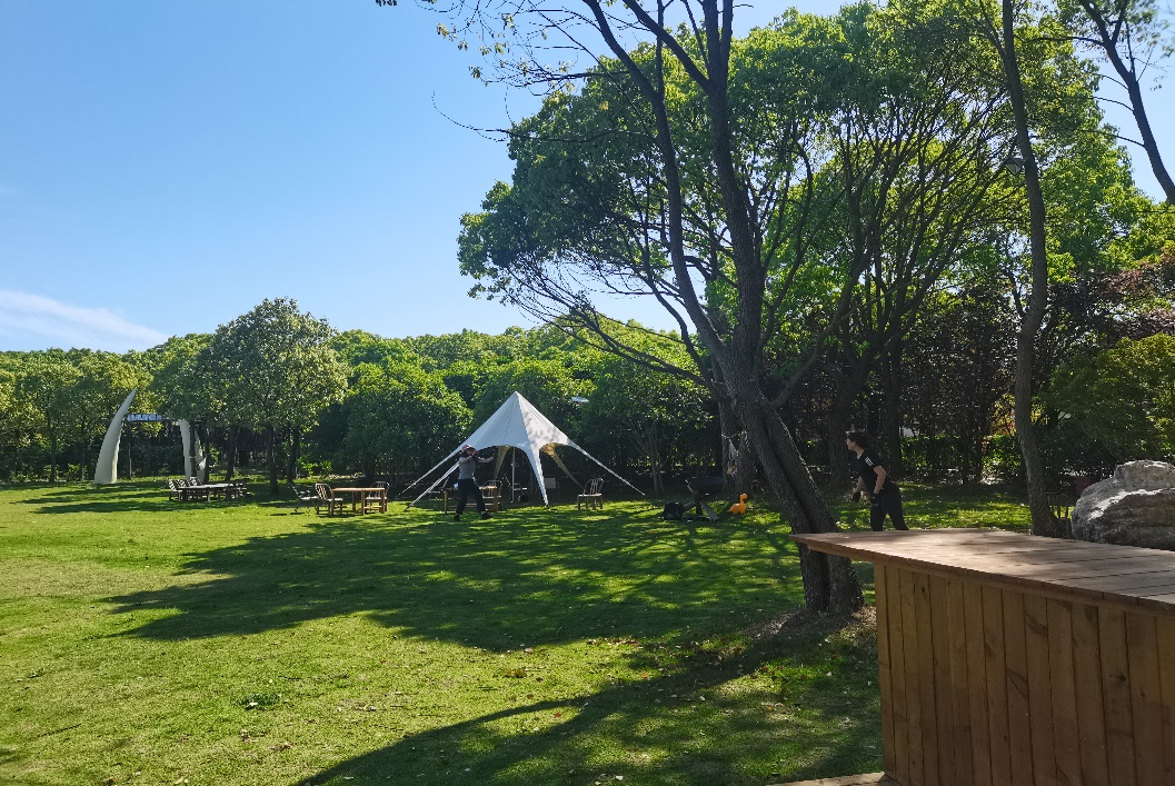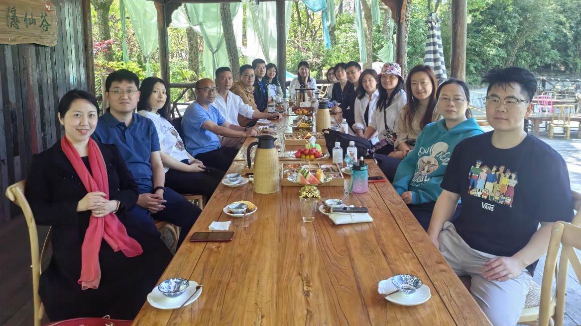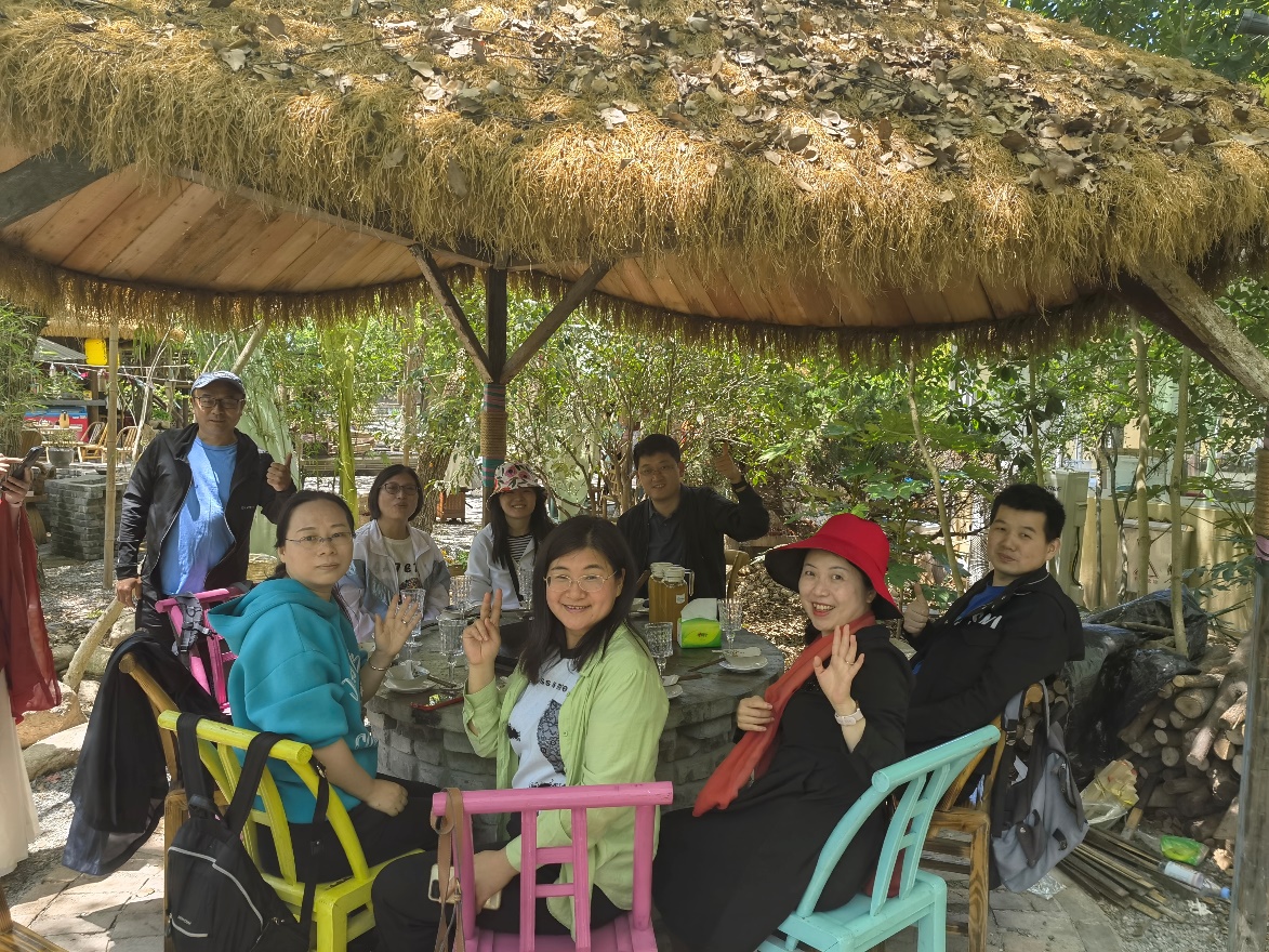 上午9点,全体职工在院内集合出发,经过约40分钟车程顺利抵达“仙渡·隐仙谷”。这个隐藏在山林草地间的古风胜地,以其古色古香的建筑和娱乐设施,为大家营造出远离城市喧嚣的避世之感,尽享古风雅趣。到达后,全体职工在纳凉亭“聚义厅”与“仙渡·隐仙谷”运营经理鞠总进行了一场半户外的茶话会。鞠总详细介绍了项目的来龙去脉、发展优势以及面临的挑战,并与大家分享了未来的发展规划和活动安排。结合我所在城市发展、区域发展、城乡一体化、老年化与养老发展、人口发展等方面的研究特长,尤其是多位专家长期深耕超大城市乡村振兴研究领域,双方就城乡融合与乡村振兴过程中的土地、产业和治理等议题进行了深入交流,纷纷表示期待后续更加紧密的合作,通过理论与实践相结合,为项目的可持续运营和上海的乡村振兴添砖加瓦。